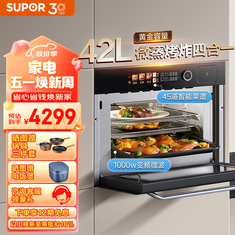 苏泊尔(SUPOR)嵌入式微蒸烤炸一体机 家用多功能台式微波蒸汽烤箱 42L大容量UW50价格:4299.00元!