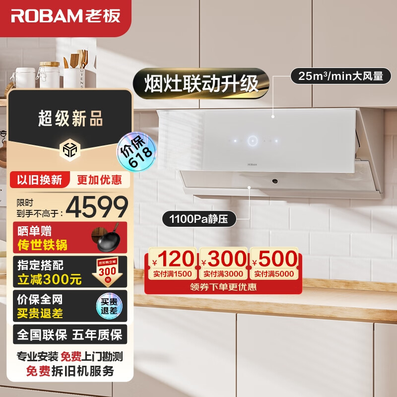老板(Robam)【灵犀烟灶联动升级】抽油烟机智能变频25风量侧吸式油烟机家用大吸力吸油烟机29X8S白色烟机价格:4599.00元!
