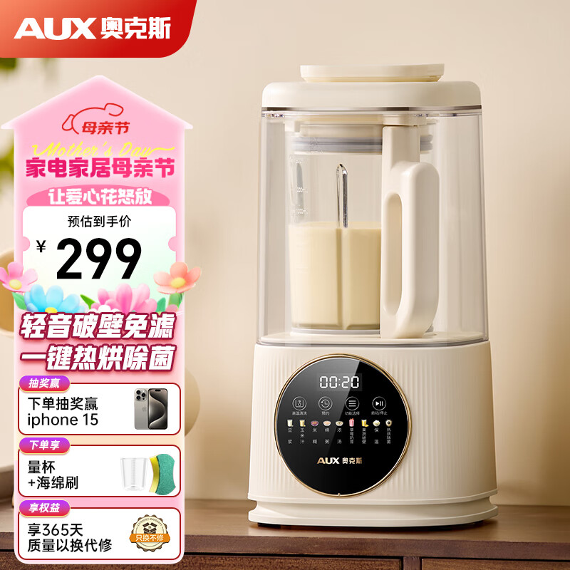 奥克斯(AUX)柔音破壁机家用免滤豆浆机全自动多功能榨汁机辅食机搅拌机早餐机一键预约热烘干防糊底HX-PB9782Z价格:259.00元!