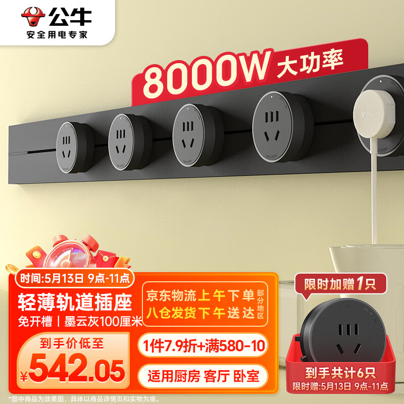公牛(BULL)明装 轨道插座 大师轻薄款可移动墙壁插座壁挂式滑轨插座 免打孔 100厘米轨道+5个五孔 墨云灰价格:539.00元!