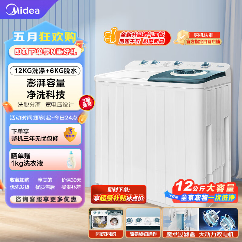 美的(Midea)双桶洗衣机半自动 MP120V513E 12公斤大容量 半自动洗衣机 洗12kg+甩6kg 双缸洗衣机价格:699.00元!