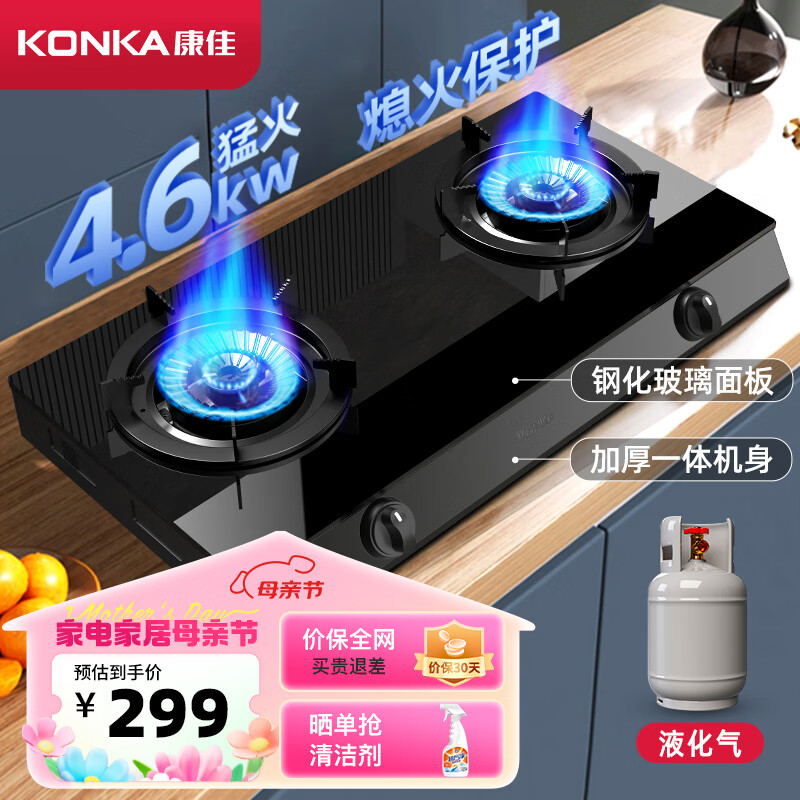 康佳(KONKA)灶具燃气灶双灶台灶 4.6kW猛火家用台式 液化气煤气灶 黑色玻璃面板炉具 JZY-T526Y(液化气)价格:298.50元!