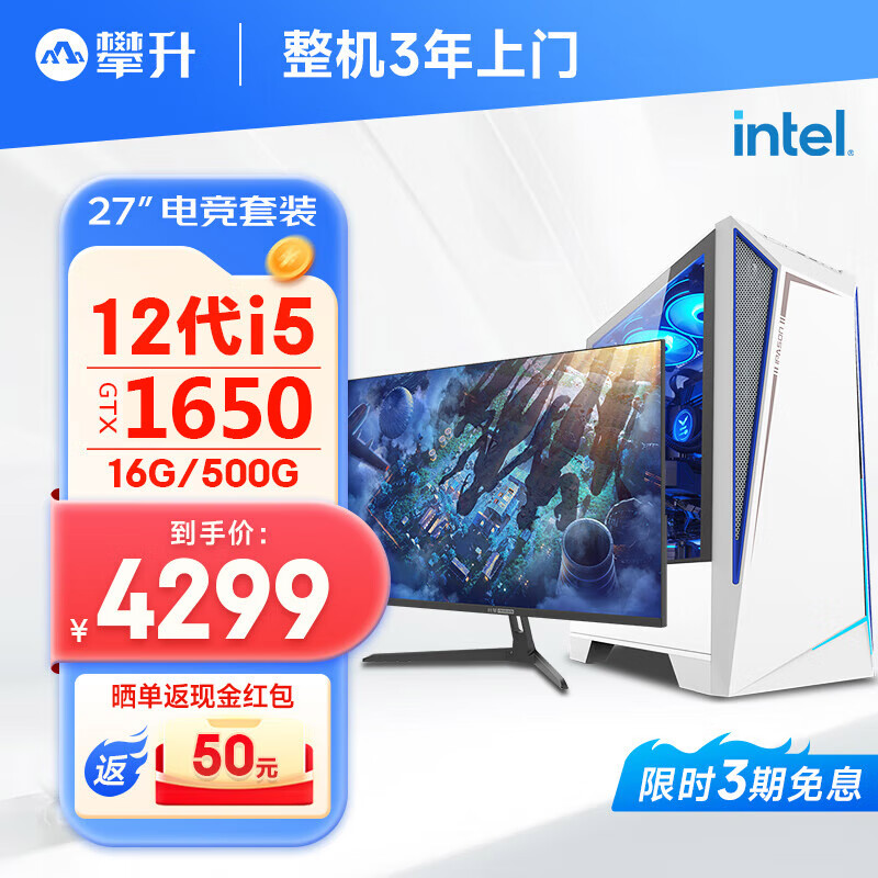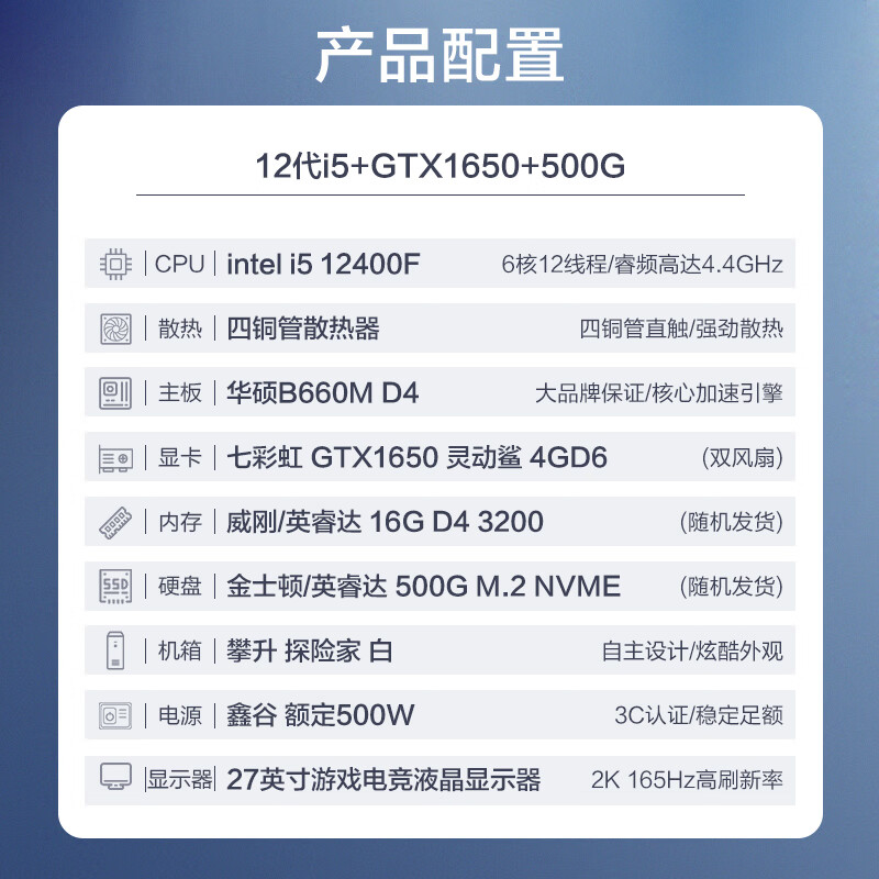 攀升探险家 12代i5 12400F/GTX1650/华硕B660/500G nvmeM.2/16G游戏台式电脑27英寸全套整机diy组装机价格:4299.00元!