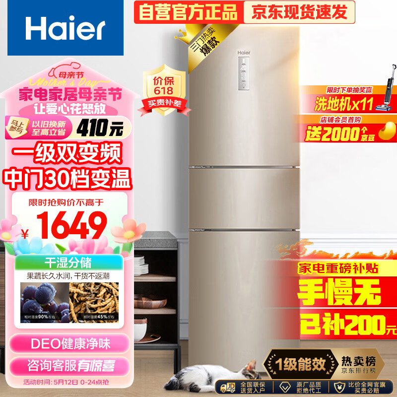 海尔(Haier)223升风冷无霜三开门多门电冰箱小户型家用宿舍出租房 一级能效节能省电低噪中门变温BCD-223WDPT价格:1649.00元!