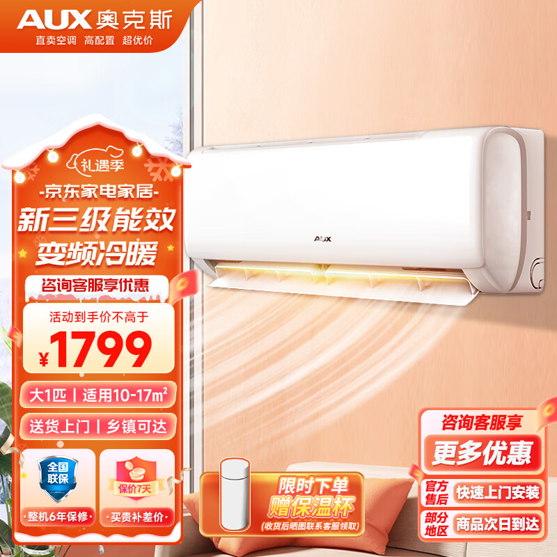 奥克斯空调大1匹 新能效 空调挂机 自清洁 独立除湿 低噪节能 挂壁式家用卧室空调 PQK24价格:1749.00元!