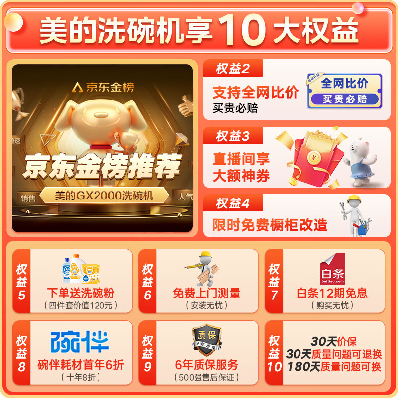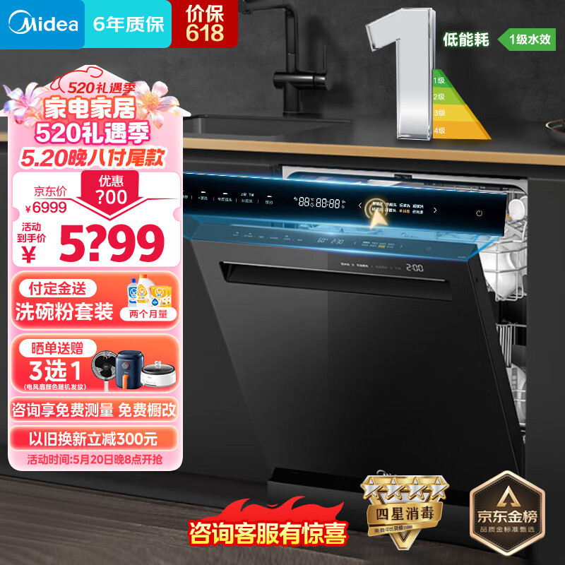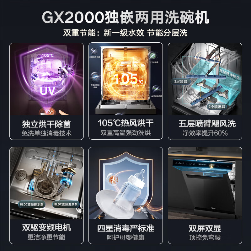 美的(Midea)15套嵌入式洗碗机GX2000【一键独立消毒 】105℃热风烘干 五臂飓风洗 双驱变频 新一级水效价格:12999.00元!