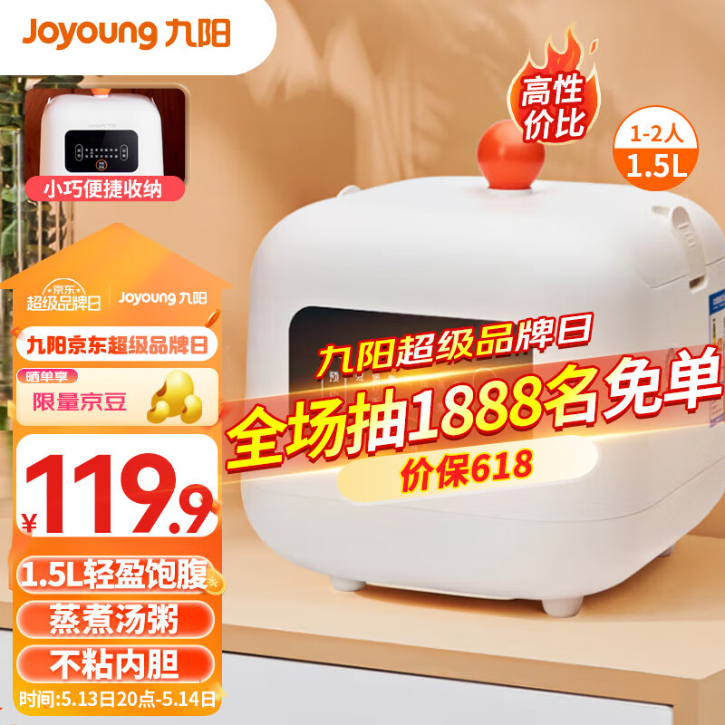 九阳(Joyoung)小型饭煲1.5升迷你智能电饭煲电饭锅简单操控面板黑晶不粘内胆多功能蒸煮煲汤 F121(推荐1-2人)价格:119.80元!