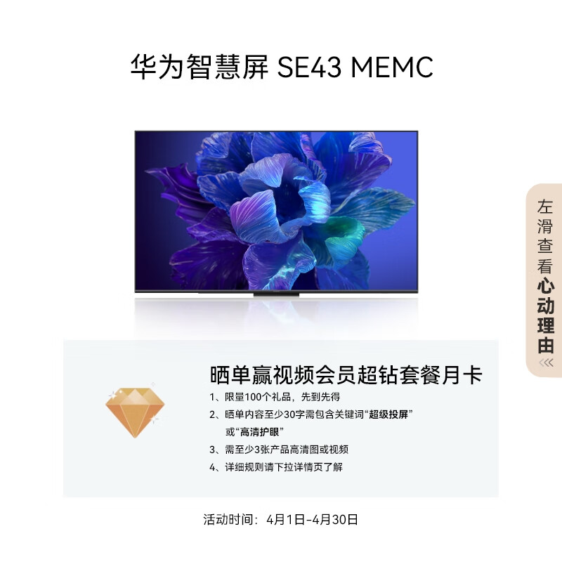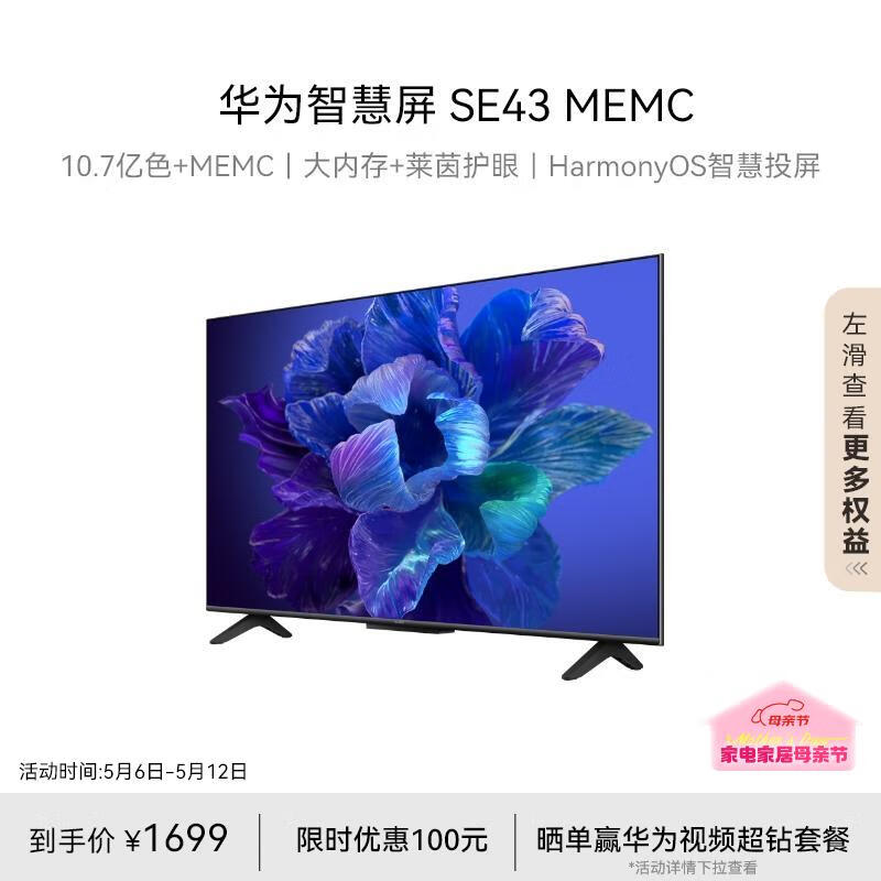 华为智慧屏 SE43 MEMC 43英寸超薄屏4K超高清智能液晶电视机卧室护眼2+16GB 以旧换新HD43KHAA价格:1699.00元!
