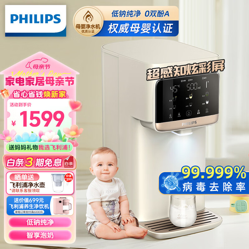 飞利浦家用台式免安装RO反渗透直饮水机 低纳泡奶机 水通道蛋白过滤净热一体机 【母婴级净饮机】ADD6820价格:1599.00元!