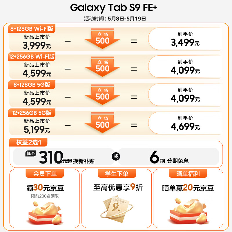 三星(SAMSUNG) S9 FE+2023款Tab平板电脑12.4英寸8+128GBWIFI版护眼高清大屏IP68防水含Spen薄荷绿价格:3499.00元!