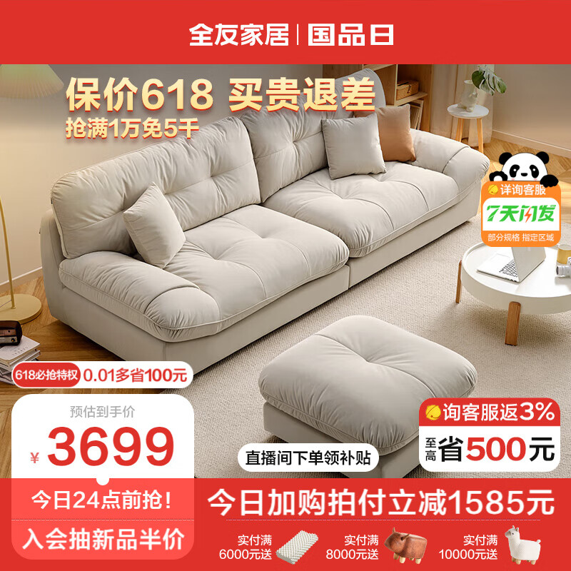全友家居 奶油风布艺沙发客厅小户型直排防猫抓布云朵沙发卧室111039价格:5284.29元!