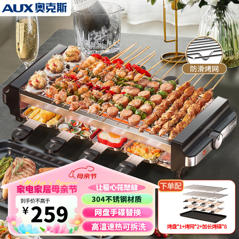 奥克斯(AUX)电烧烤炉 电烤盘家用无烟电烤架烧烤架烤肉机电烤炉烤肉锅烤串机不锈钢LA-SKL18价格:259.00元!