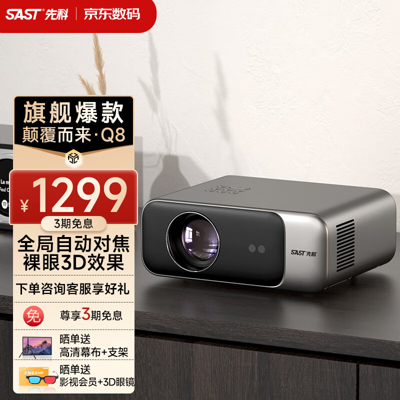 先科(SAST)Q8 投影仪家用 投影机办公 卧室超高清智能投影(真1080P 自动对焦 自动梯形校正 AI语音控制)价格:1699.00元!
