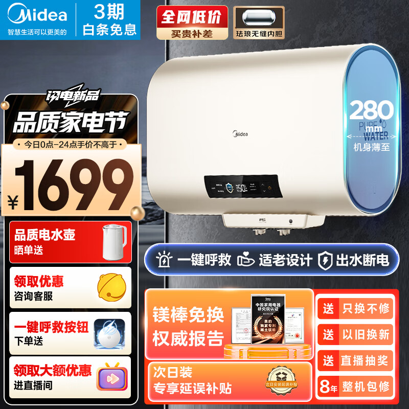 美的(Midea)玲珑50升超薄双胆扁桶电热水器3200W变频 免换镁棒出水断电浴室防摔一键呼救F5032-CA7(HY) 美颐享价格:1699.00元!