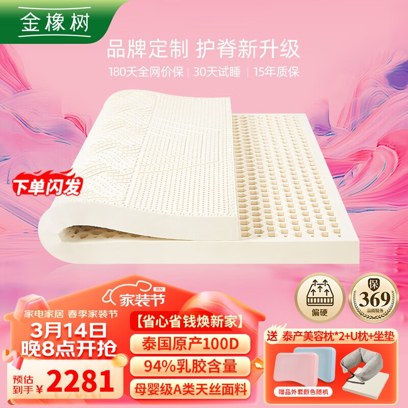 金橡树高密度100D泰国原产进口天然乳胶床垫1.8米品牌定制 大女主价格:2281.00元!