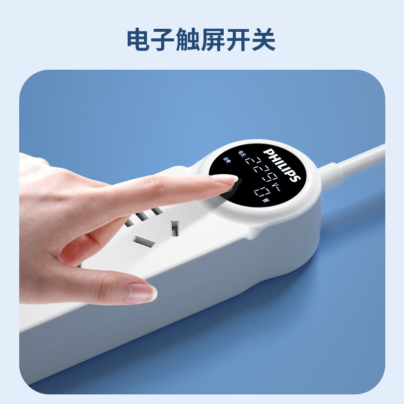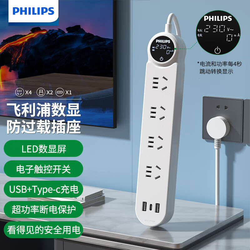 飞利浦(PHILIPS)新国标数显插座超功率保护 防过载USB插排/插线板/接线板/拖线板 LED数显触控1.8米【4位总控】价格:89.00元!