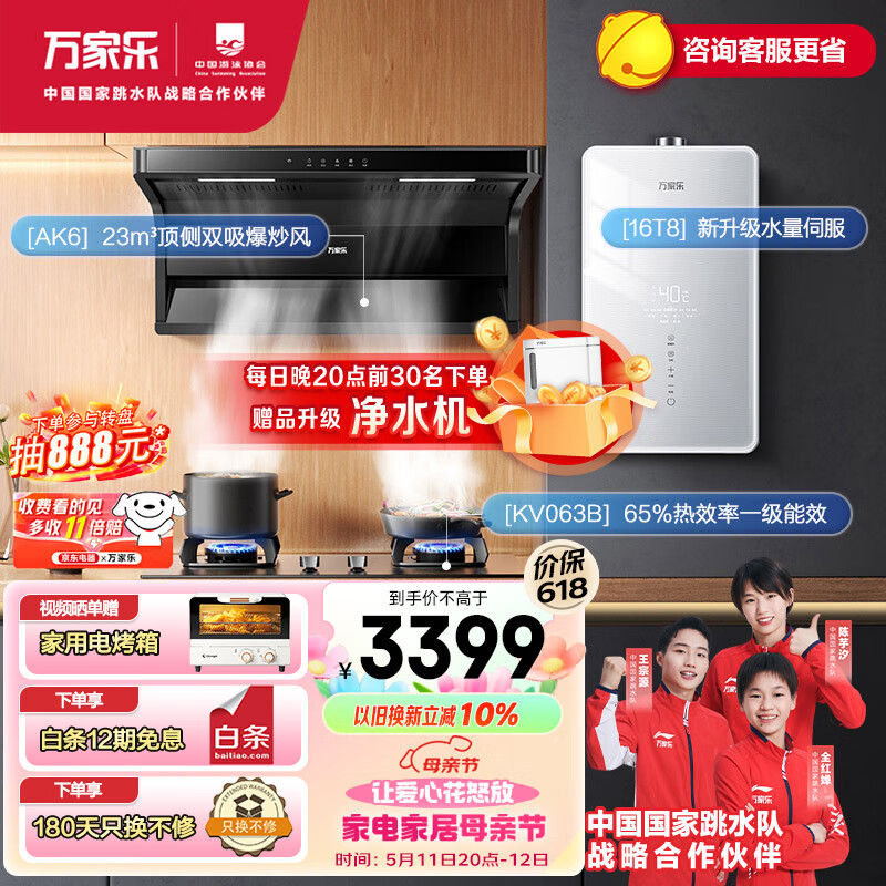 万家乐烟灶热三件套 23立方顶侧双吸油烟机16L水量伺服器全景屏热水器套装AK6+KV063B+16T8天然气价格:3599.00元!