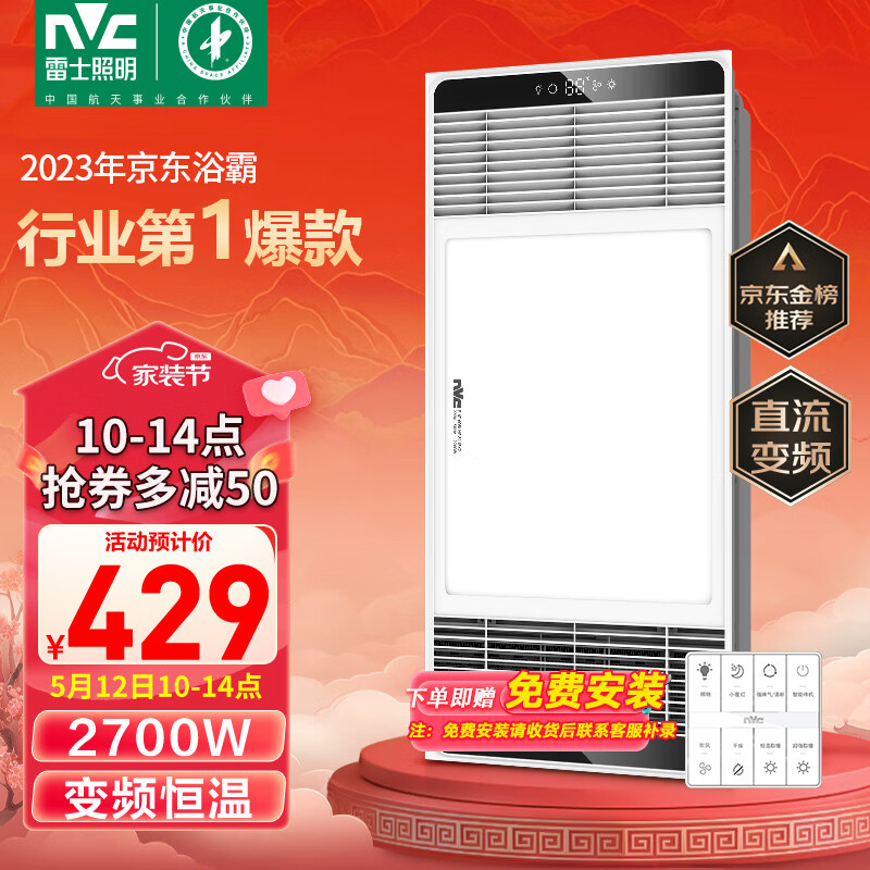 雷士(NVC)智能变频超薄极简浴霸浴室暖风照明排气一体卫生间集成吊顶Y346价格:639.00元!