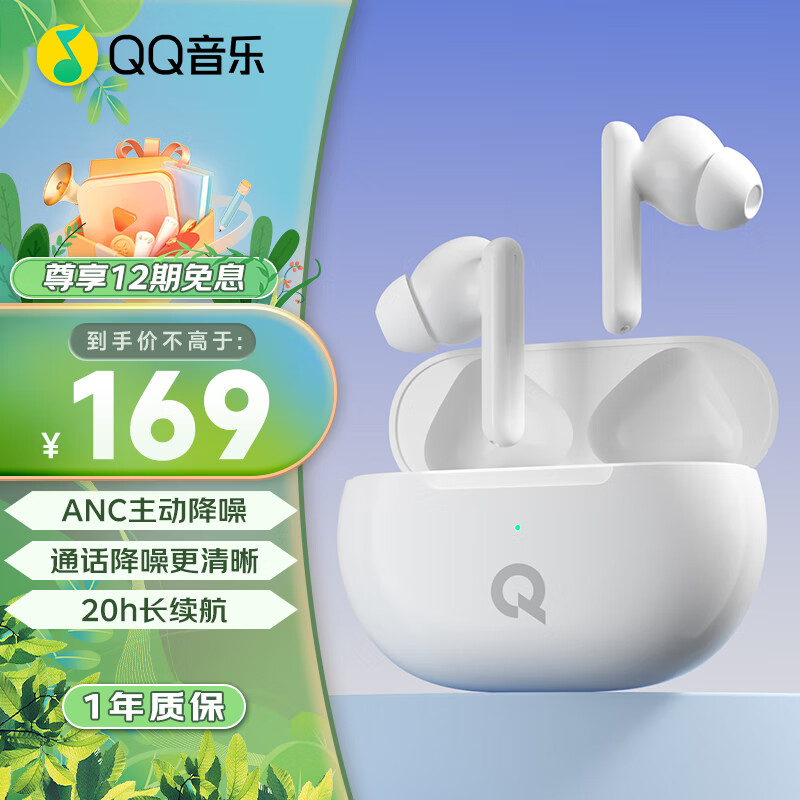 QQ音乐 H1-白色 ANC真无线蓝牙耳机主动降噪入耳游戏低延迟通话降噪无线高音质运动跑步适用华为苹果小米价格:169.00元!