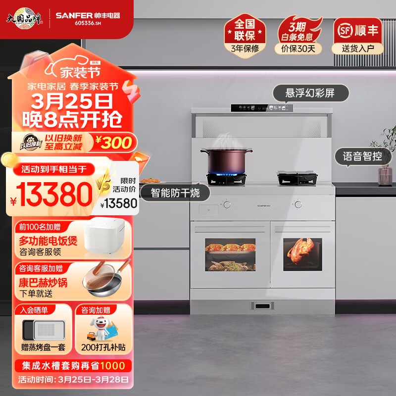 帅丰(SANFER)TJ3-8B-90 集成灶蒸烤一体 蒸烤独立集成灶一体式 左蒸右烤 家用蒸箱烤箱 白色价格:14080.00元!
