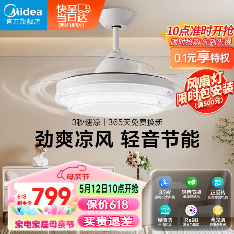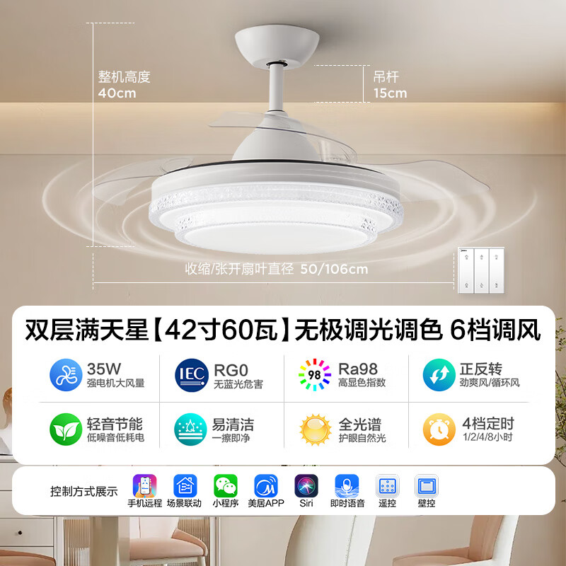 美的(Midea)吊扇灯风扇灯LED照明隐形餐厅卧室客厅防蓝光语音42寸灯饰灯具价格:954.00元!