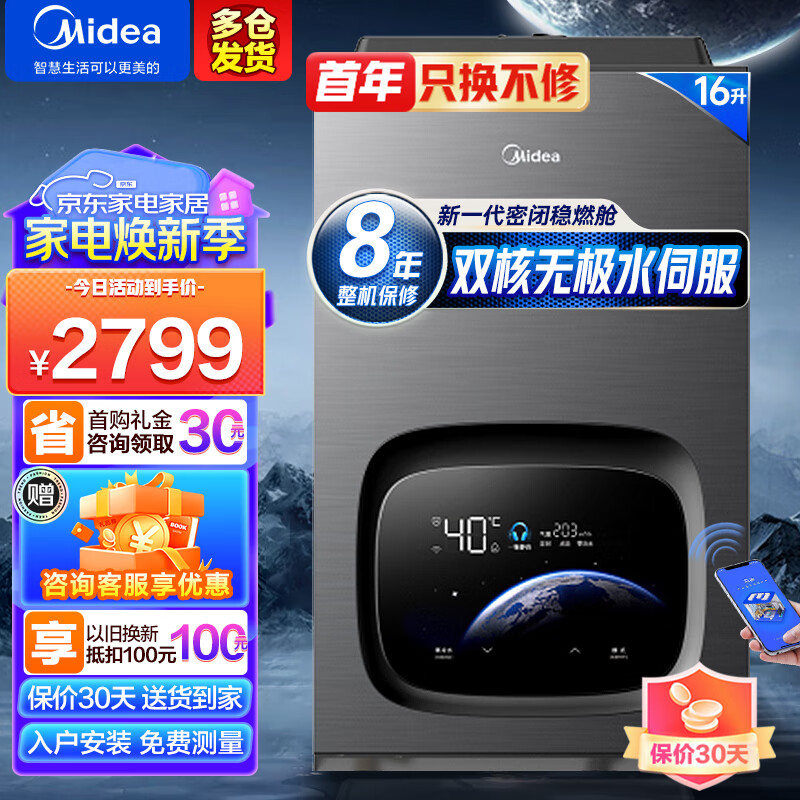 美的(Midea)16升燃气热水器天然气 一级静音 变频节能水伺服恒温 双增压零冷水 变频节能 安睡JSQ30-M5价格:2799.00元!