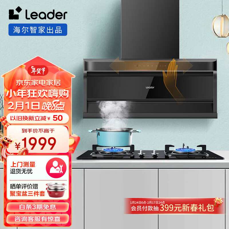 Leader海尔智家出品 顶侧双吸抽油烟机 24m3/min大吸力 挥手智控 油烟机灶具套装 IQ92D+Q2BE1(天)价格:1999.00元!