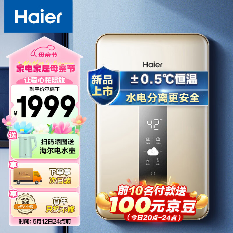 海尔(Haier)电热水器 即热式 高颜值 即开即热一键AI 节能/生活双模式 防电墙 DSH-85AD1价格:2199.00元!