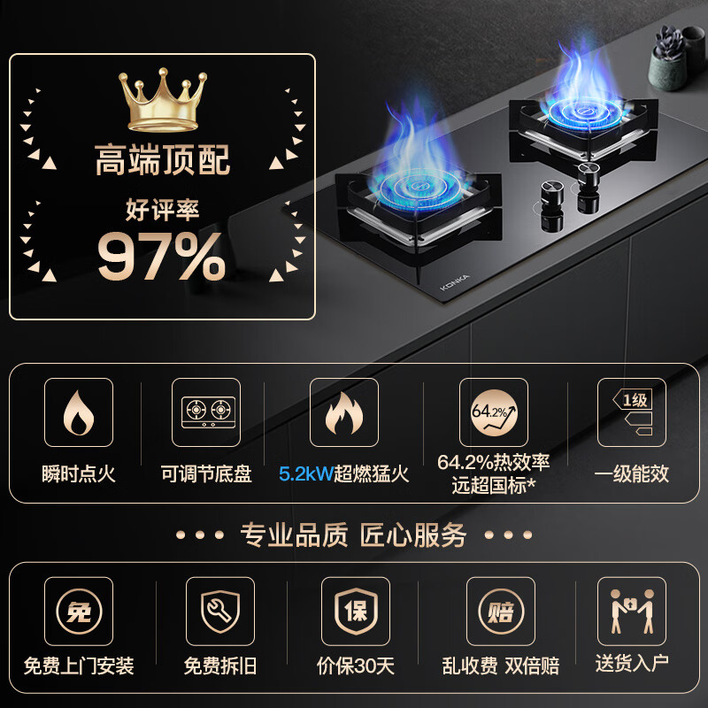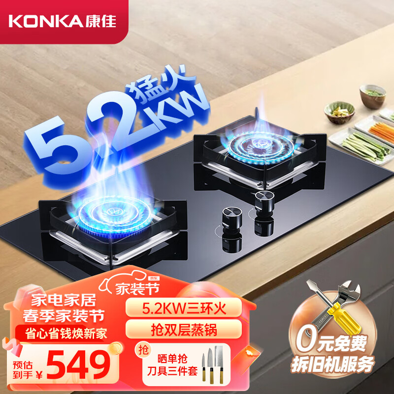 康佳(KONKA)燃气灶双灶具 5.2kW天然气双灶 家用三环火猛火灶 台嵌两用 钢化玻璃灶台 JZT-B520T(天然气)价格:549.00元!