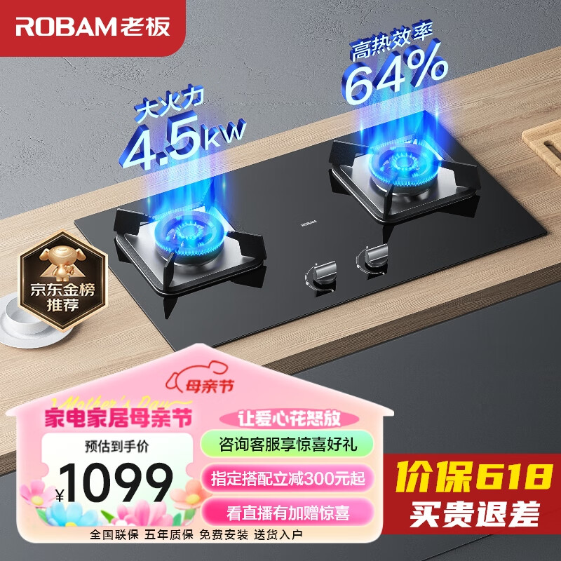 老板(Robam)JZT-32B7D家用钢化玻璃面板台嵌两用小尺寸易打理挖孔燃气灶 4.5kW 天然气灶具双灶价格:1099.00元!
