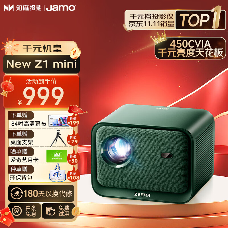 知麻New Z1 mini 投影仪家用 投影机卧室客厅 智能家庭影院芝麻(450 CVIA流明 全自动校正 全域清晰)价格:999.00元!