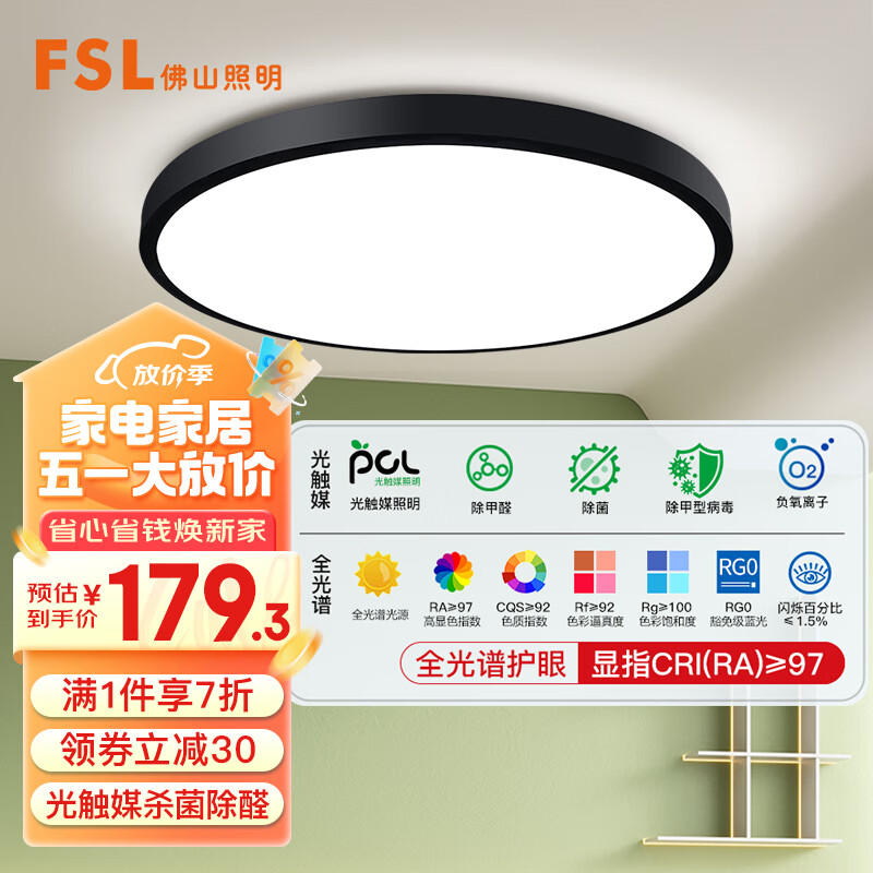 FSL佛山照明全光谱护眼吸顶灯光触媒卧室灯豁免级蓝光Ra97绅士黑36W价格:299.00元!