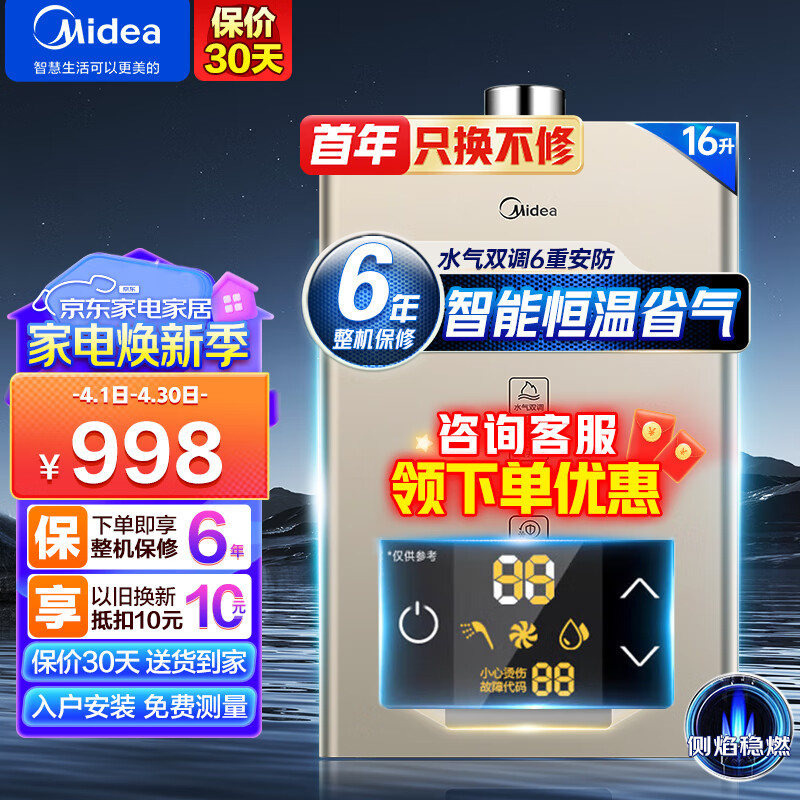 美的燃气热水器16升家用天然气即热式水气双调变频恒温节能ECO省气多重防护强排式热水器 JSQ30-16KMA价格:998.00元!