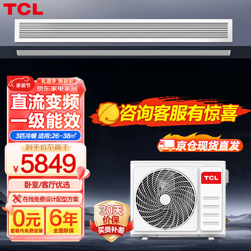 TCL中央空调3匹风管机一拖一家用变频冷暖嵌入式空调卡机包安装适用26-38㎡KFRD-Vd72F5AW/N3Y-E2价格:5388.20元!