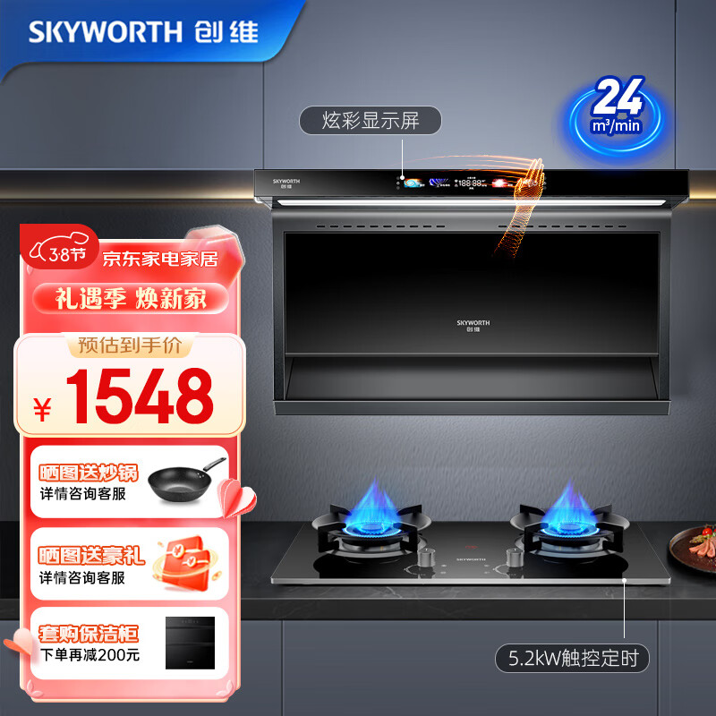 创维(Skyworth)抽吸油烟机灶具套装 顶侧双吸排油烟机燃气灶套餐烟灶套装家用24风量自动清洗Y705+Z200天然气价格:1598.00元!