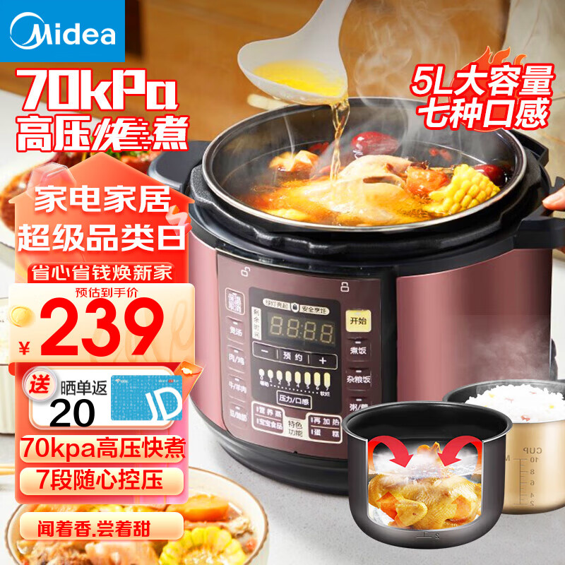 美的(Midea) 电锅 高压锅 电高压锅家用大容量多功能定时预约高压电饭煲电饭锅 尊享款 行业TOP【4-10人 双胆】 5L价格:309.00元!