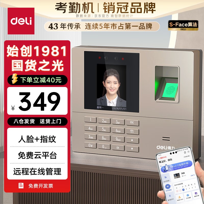 得力智能云考勤机 打卡机人脸+指纹 wifi联网 APP在线管理 实时查看考勤 刷脸考勤机33800CS价格:389.00元!