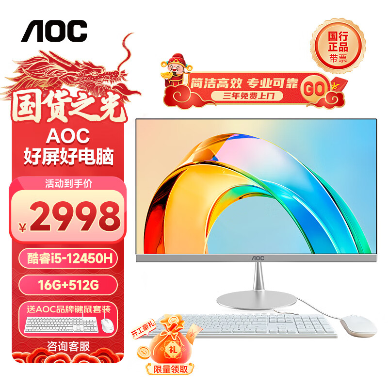 AOC美人鱼734Pro 23.8英寸高清办公网课学习台式一体机电脑(12代i5-12450H 16G 512G 双频WiFi )白价格:2998.00元!
