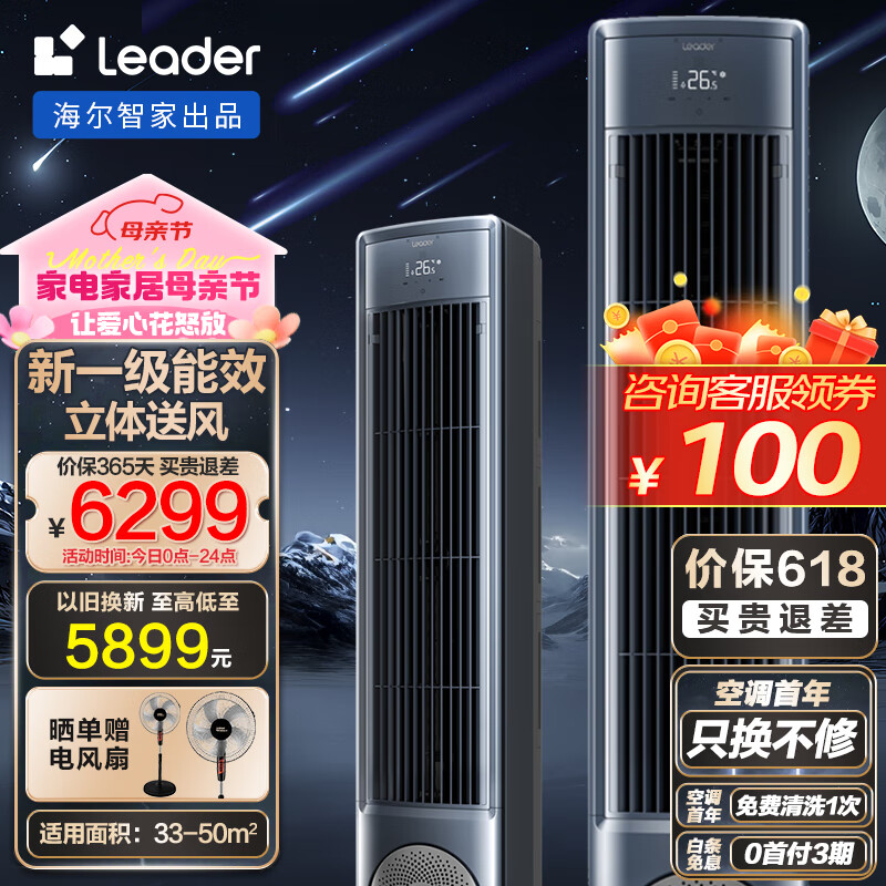 Leader海尔智家新风空调立式大3匹家用冷暖新一级能效变频节能柜机自清洁空调KFR-72LW/01VDA81TU1[家电]价格:6299.00元!