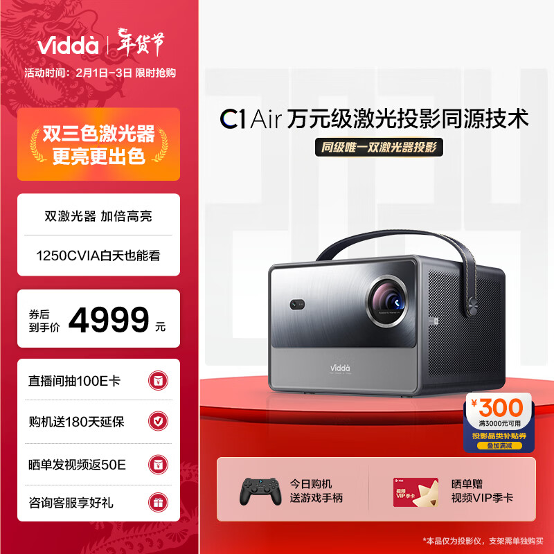 Vidda C1 Air 海信纯三色激光 高清投影仪家用户外便携投影机 卧室投屏办公室客厅智能家庭影院价格:5299.00元!