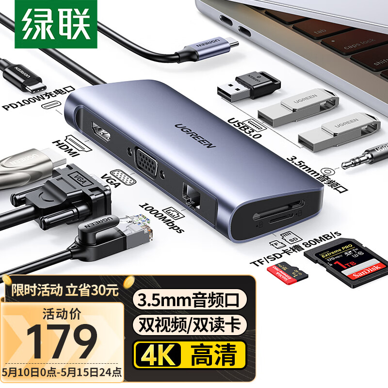 绿联Type-C扩展坞USB-C转HDMI雷电4拓展坞VGA网线转接头分线器音频读卡器通用苹果15Mac华为笔记本电脑价格:209.00元!