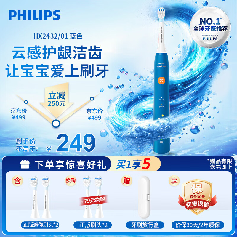 飞利浦儿童电动牙刷适用4-12岁 2种柔护模式温和清洁 自带2支刷头 生日礼物 儿童泡泡刷HX2432蓝色价格:499.00元!