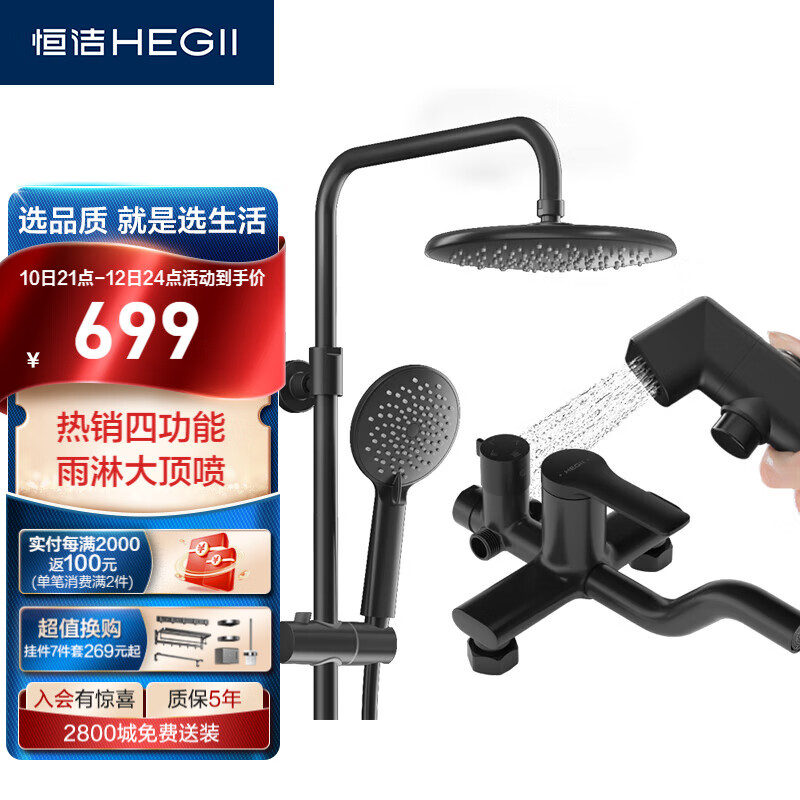 恒洁(HEGII)淋浴花洒套装 防烫增压喷枪 一键四控大顶喷花洒HMF916-333B-BC价格:799.00元!