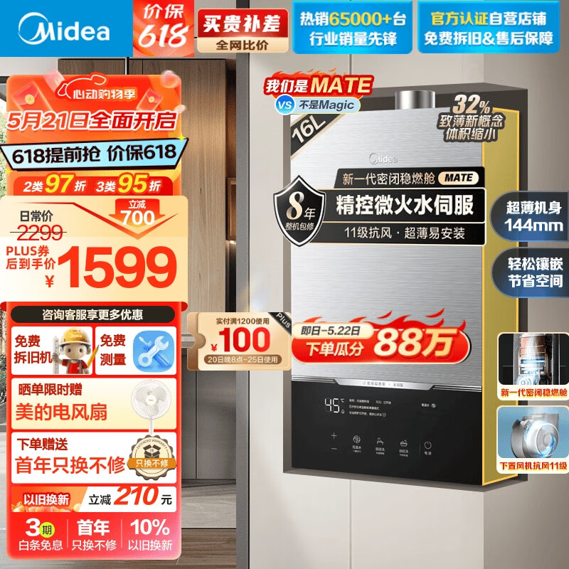 美的(Midea)16升燃气热水器 天然气 低噪增压水伺服恒温 下置风机 高楼层抗风 新一代密闭稳燃 JSQ30-MATE致薄价格:1799.00元!