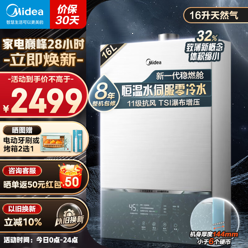 美的(Midea)燃气热水器天然气热水器16升恒温变频强排式即热下置风机微孔降噪密闭稳燃舱JSQ30-MATE Ultra价格:3099.00元!