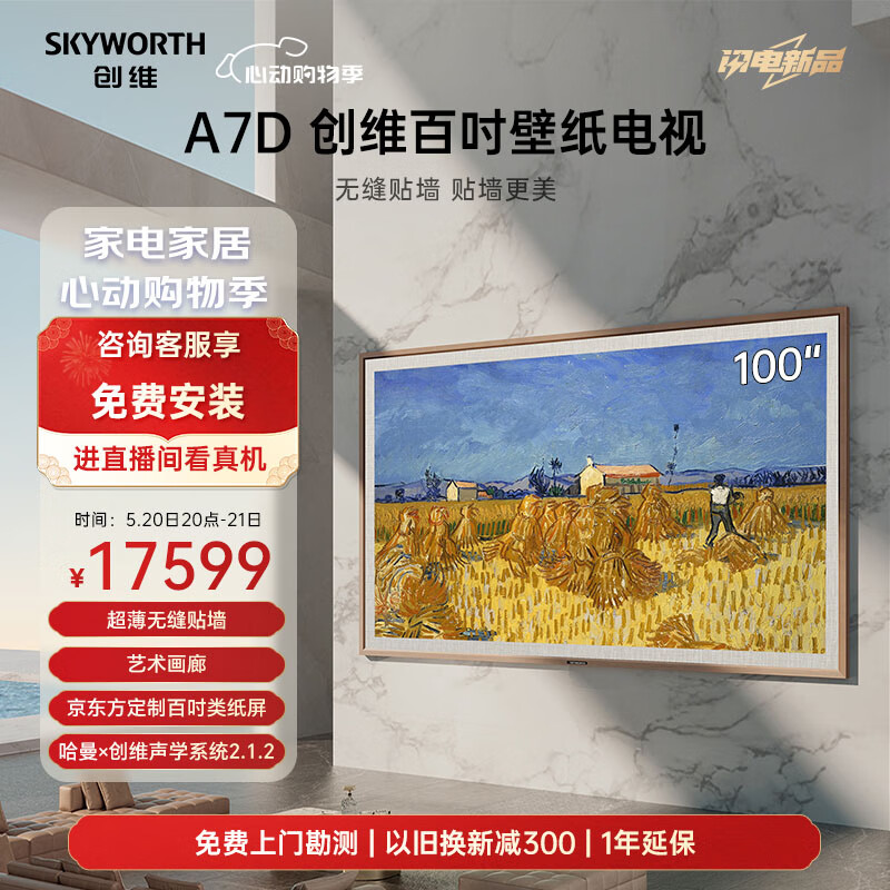 创维壁纸电视100A7D 100英寸超薄壁画艺术电视机 无缝贴墙百变艺术屏 护眼超薄巨幕大屏价格:17999.00元!