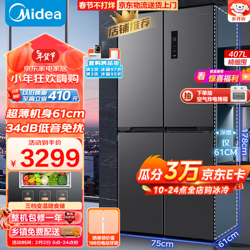 美的(Midea)61厘米薄407升一级智能双变频十字对开双开门四开门家用电冰箱大容量BCD-407WSPZM(E)超薄可嵌入价格:3499.00元!