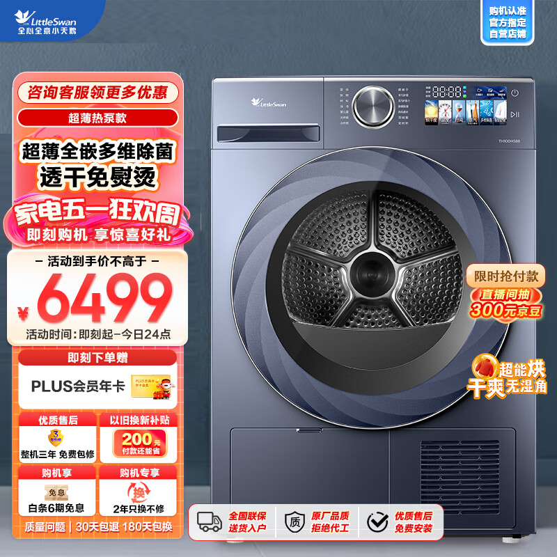 小天鹅(LittleSwan)烘干机 10kg家用热泵干衣机 紫外线除菌 蒸汽免熨 超薄全嵌-纤彩 智能TH100HS88【小乌梅高奢版】价格:6499.00元!