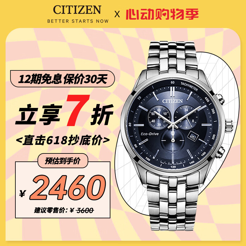 西铁城(CITIZEN)手表男日韩表光动能三眼蓝盘日显钢带商务送礼物男友AT2140-55L价格:2460.00元!