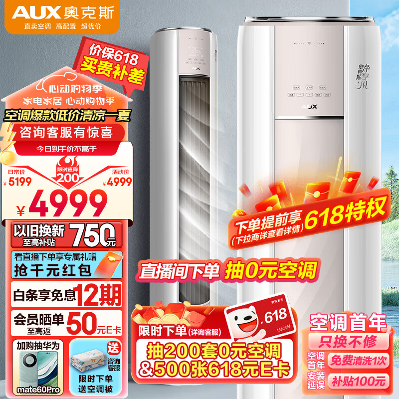 奥克斯(AUX)立式空调 3匹柜机 一级能效柜机 客厅节能?WIFI智控 超远风 升级大风口(KFR-72LW/BpR3AQE1(B1))价格:4999.00元!